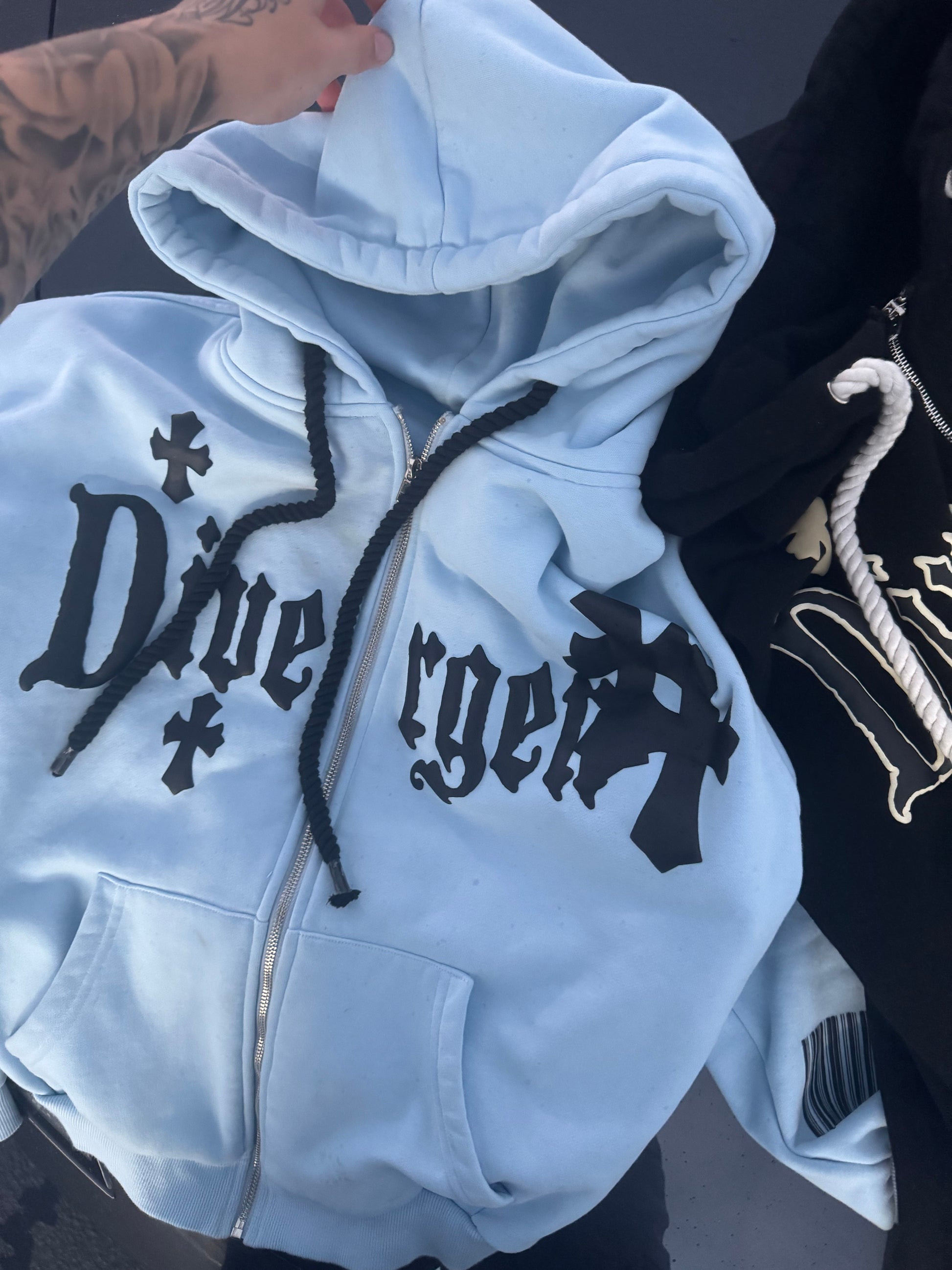 The Divergent Zip-Up Hoodie brings a fresh streetwear vibe with its bold black “Divergent” print and cross details across the chest. Designed in a sleek light blue colorway, this hoodie combines comfort and style, making it a go-to essential for any fit. A unique barcode graphic on the sleeve adds a subtle edge, setting it apart from your everyday hoodie.